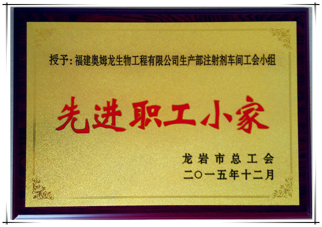 2016年4月1日,在新羅區(qū)總工會(huì)十七屆六次全委(擴(kuò)大)會(huì)議上,福建奧姆龍生物工程有限公司生產(chǎn)部注射劑車間工會(huì)小組被授予“先進(jìn)職工小家”榮譽(yù)稱號(hào)。
