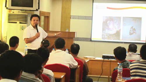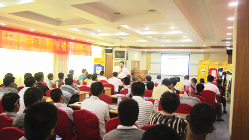 會議上,技術總監(jiān)郭金權講解病情,為養(yǎng)殖戶排憂解惑。