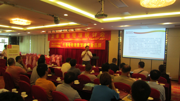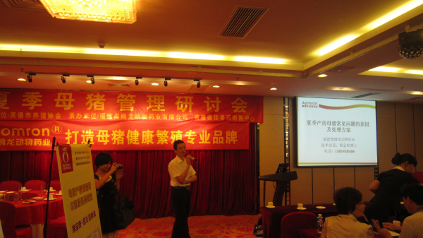2013年6月14日,公司在廣東英德召開“夏季母豬管理研討會”暨公司技術(shù)推廣會,會議在董事長林振雁的主持下拉開了序幕。緊接著公司技術(shù)部總監(jiān)郭金權(quán)老師針對“夏季產(chǎn)房母豬常見問題的原因及處理方案”進行了詳細的解說,會議現(xiàn)場座無虛席,互動氛圍熱烈。