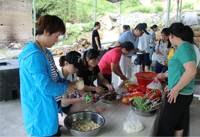 因?yàn)槭孪纫呀?jīng)分好組,到達(dá)目的地后,大家開始自覺(jué)地準(zhǔn)備食物,洗菜的、削水果的、煮米粉的、串肉的,忙的不亦樂(lè)乎,每個(gè)人臉上都帶著笑容,人多力量大,瞬間就把該準(zhǔn)備的東西都備好了,那么就開始燒烤吧。