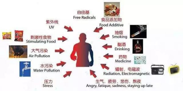 環(huán)境中的輻射、空氣污染、吸煙、農(nóng)殘等都會(huì)使人體產(chǎn)生更多活性氧自由基,此外過量運(yùn)動(dòng)和重度的精神壓力也會(huì)導(dǎo)致自由基數(shù)量明顯上升。