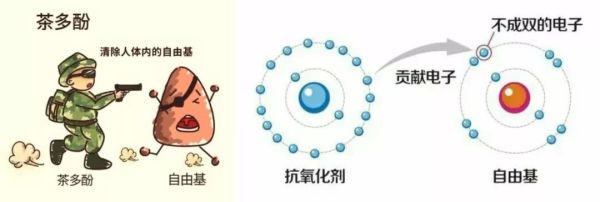 茶葉中的茶多酚是由一系列多酚類化合物組成,這些化合物富含氫氧OH基團(tuán)(羥基),負(fù)電荷的離子形式存在使其具有還原性質(zhì)和很強(qiáng)的捕獲自由基的作用。從而消滅或者減少自由基對(duì)人體的侵害。