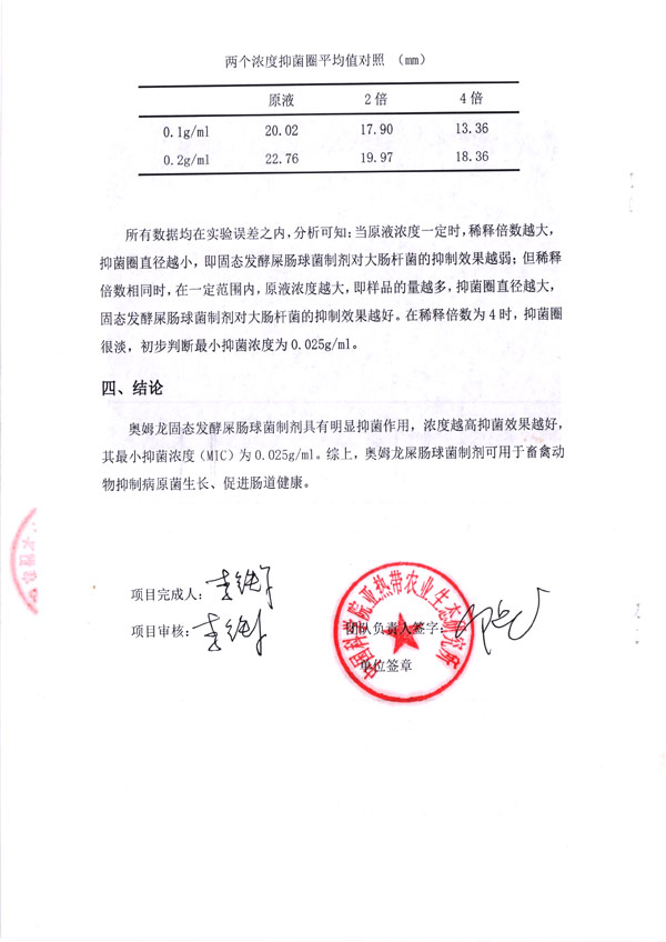 中科院研究結(jié)果表明固態(tài)發(fā)酵的屎腸球菌對大腸桿菌具有明顯的抑制作用,濃度越高抑菌效果越好,其最小抑菌濃度(MIC)為0.025g/mL。綜上,奧姆龍固態(tài)發(fā)酵屎腸球菌制劑可用于畜禽動物抑制病原菌生長、促進腸道健康。