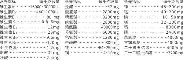 【原料組成】賴氨酸、蛋氨酸、精氨酸、亮氨酸、組氨酸、色氨酸、?;撬帷㈦u肉粉、魚(yú)粉、深海魚(yú)油、椰子油、亞麻籽油、復(fù)合維生素、常量礦物質(zhì)元素、復(fù)合微量元素、果寡糖、純化水等。