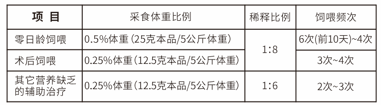1、泡水飼喂:按照1:8或6(克/克)的奶粉/溫水的比例,將奶粉溶解在40℃左右的溫開水中直至完全溶解,按照下表推薦飼喂。